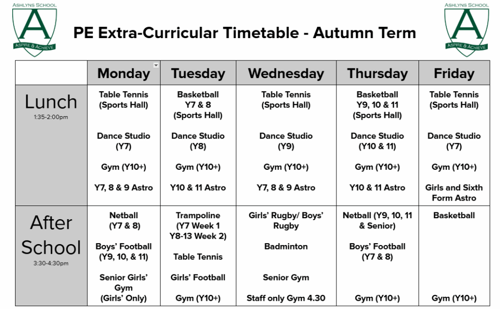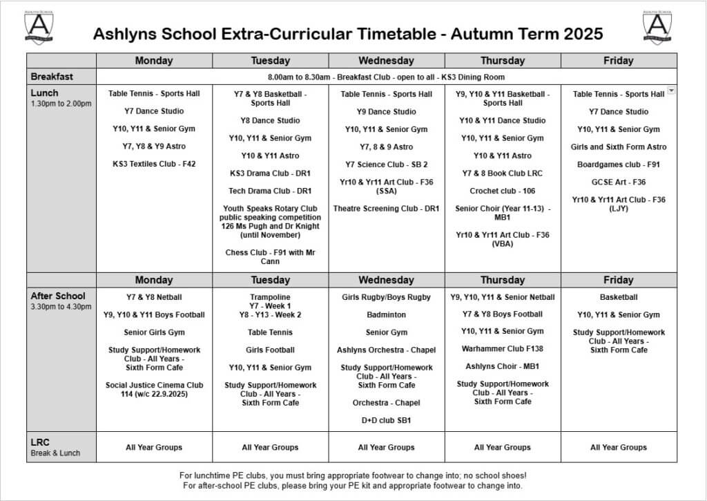 A wide and varied programme of extra curricular activities is central to our ethos of developing the whole person, inspiring students, and helping every student to achieve their potential. Students are encouraged to express themselves through sport, music, drama, technology and outdoor pursuits. Click here for sport fixtures, clubs and results. Please see below for the full extra curricular timetable for this term: