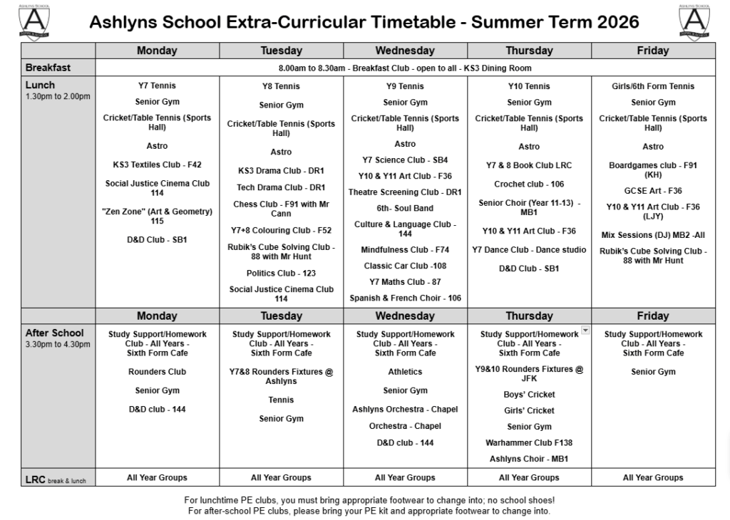A wide and varied programme of extra curricular activities is central to our ethos of developing the whole person, inspiring students, and helping every student to achieve their potential. Students are encouraged to express themselves through sport, music, drama, technology and outdoor pursuits. Click here for sport fixtures, clubs and results. Please see below for the extra-curricular timetable for the Summer term:
